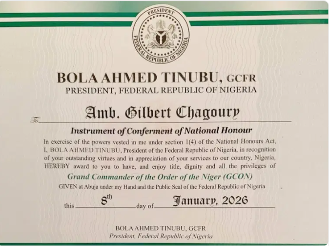 The award, conveyed through an Instrument of Conferment dated January 8, 2026, cites Chagoury’s “outstanding virtues” and services to Nigeria. Billionaire Femi Otedola praised Chagoury, saying, “Your life is a masterclass in vision, discipline, and steady excellence”.